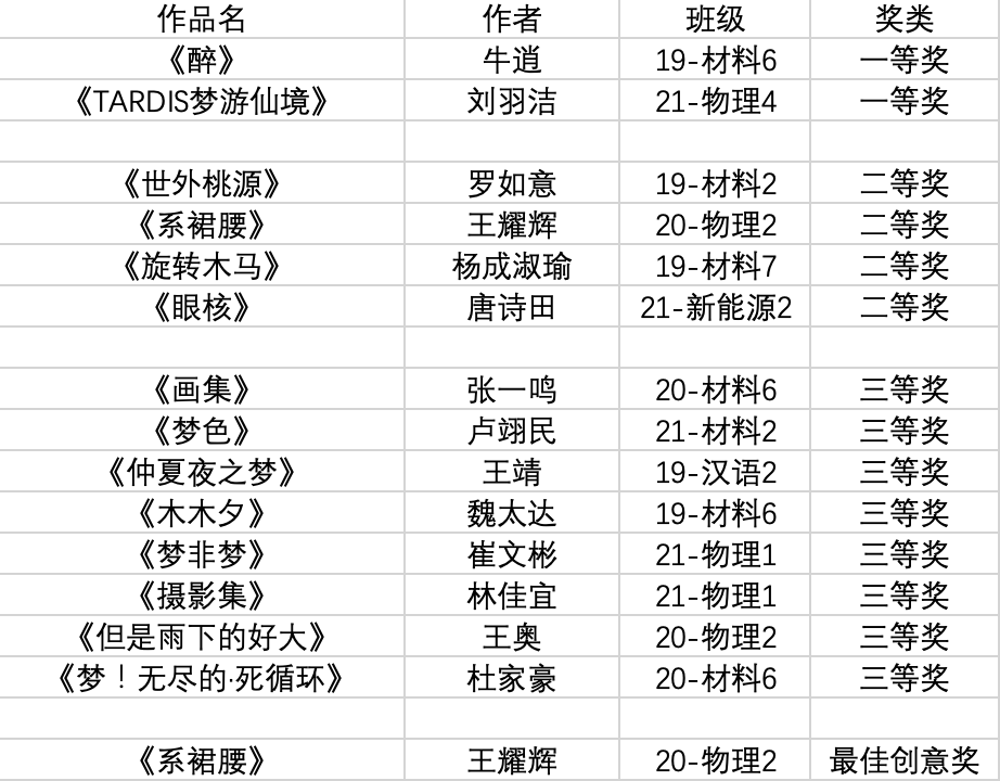 此次活动旨在让同学们从现代多元化娱乐方式中停下来,感受身体对生活的本能记忆,在回忆与描绘梦境的同时放松自己。本次活动共收集到作品42份,内容包含视频、绘画、摄影、诗歌、散文、小说等多种类型。评比共选出一等奖两名,二等奖四名,三等奖八名,最佳创意奖一名。