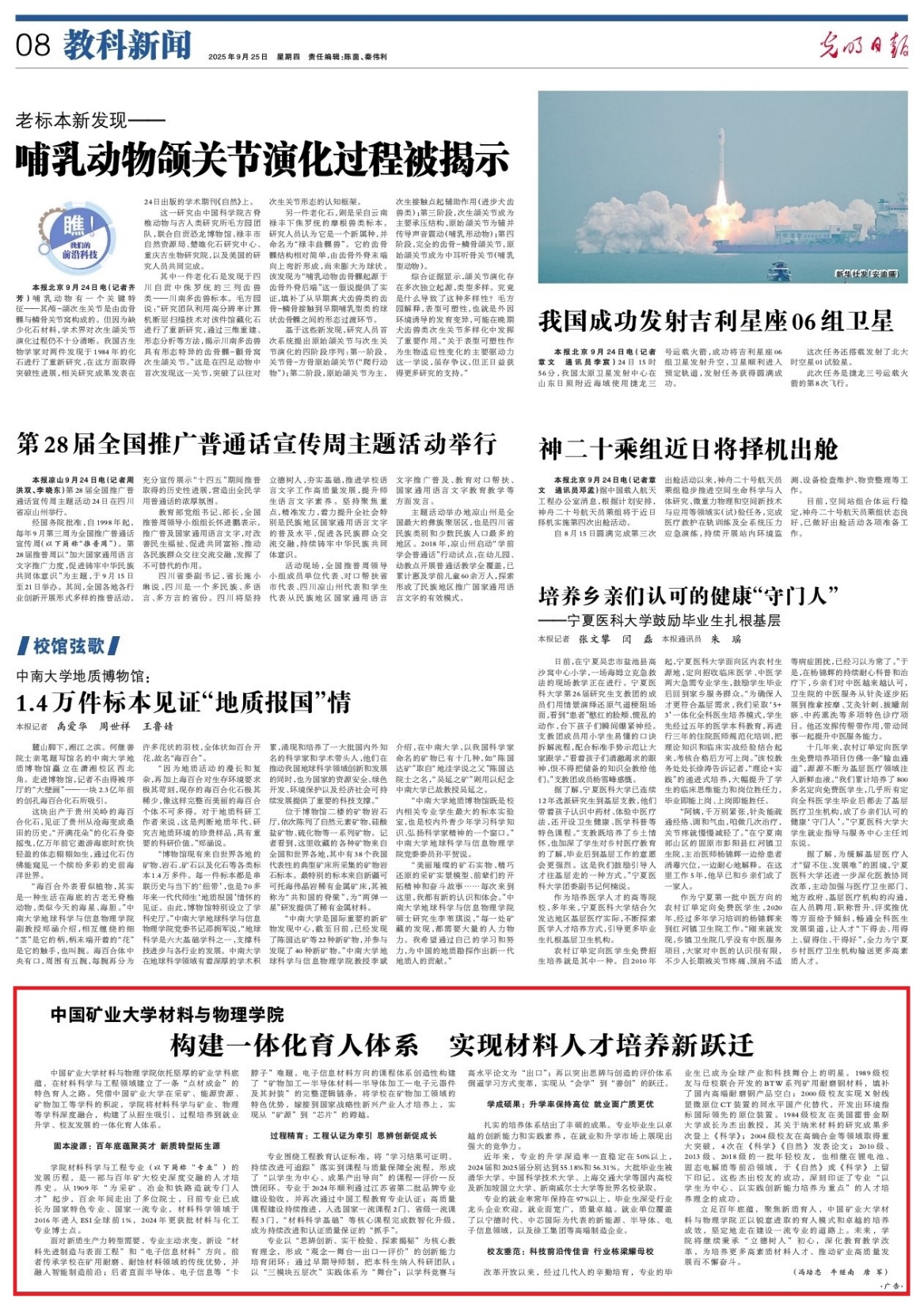2025年9月25日,《光明日报》第8版刊发专题文章“构建一体化育人体系 实现材料人才培养新跃迁”,深度报道了我院材料专业根植学校深厚矿业底蕴、面向国家战略需求所构建的特色育人体系及其显著成效。该报道从招生吸引、过程培养、就业升学和校友发展四个维度,系统梳理了专业人才培养的改革与突破,彰显了我院“点材成金”特色育人之路的丰硕成果。