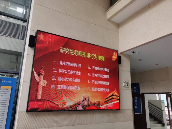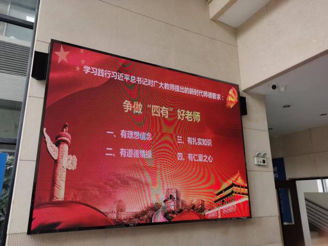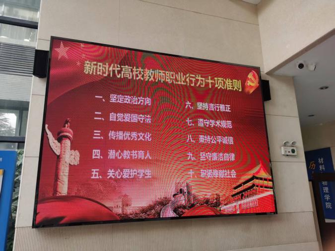 学院充分利用LED显示屏等宣传阵地,持续滚动播放师德师风建设相关内容,时刻提醒广大教师恪守职业规范,树立良好师表形象。