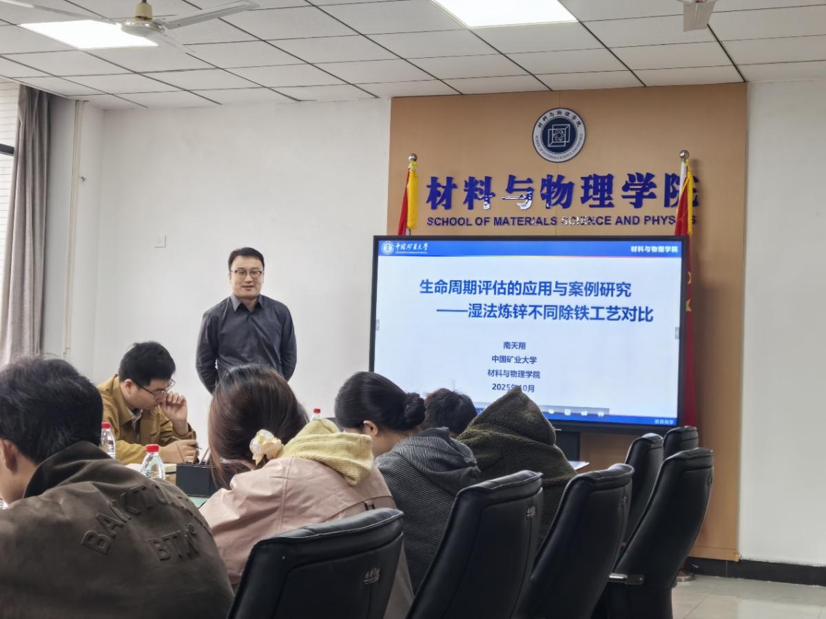 南天翔老师以“生命周期评估的应用与案例研究——湿法炼锌不同除铁工艺对比”为题展开报告。他首先对生命周期评估方法进行了简介,明确这一工具可通过追踪产品或工艺全生命周期的资源消耗与污染物排放,量化环境影响,为工艺优化提供科学依据;接着结合当今保护环境的先进理念,阐述了湿法炼锌作为有色金属冶炼重要环节的背景,以及“除铁”这一关键步骤中不同工艺环境友好性的差异,点明通过生命周期评估筛选最优除铁工艺对推动行业绿色转型的意义;随后介绍团队围绕研究目标,构建了针铁矿法工艺、黄钾铁矾法工艺、赤铁矿法工艺及剪切强化针铁矿法工艺四种流程模拟原型,并为每种工艺确立了涵盖原材料消耗、能源输入、废弃物排放等内容的生命周期清单,以此开展生命周期评估对比研究;最终从环境角度确定了最佳除铁工艺,还提出相应工艺优化策略以最大程度减少锌冶炼对环境的影响。报告中也详细科普了湿法炼锌原理,对比不同炼锌方式的优缺点,帮助在座同学对该研究方向建立基本了解和认识。