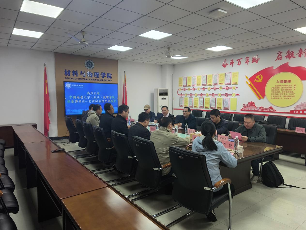 10月31日,中国地质大学(武汉)数理学院党委书记张基得一行来我院调研交流,交流会在材料楼A501召开,党委副书记李智、副院长鞠治成、教授委员会副主任李海鹏、光电信息科学与工程系主任贾传磊、应用物理系主任张俊廷、大学物理教学中心主任王洪涛和实验教学与分析测试中心副主任李艳参加会议,会议由院长冯培忠主持。