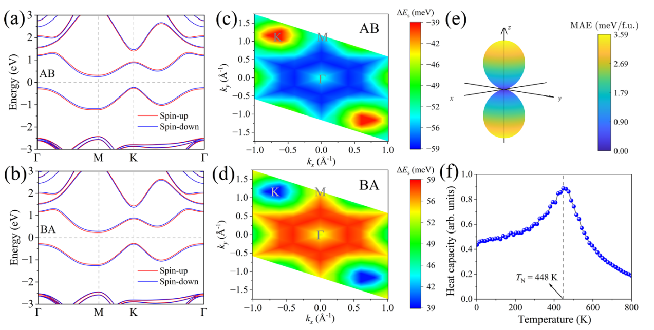 二维TaN2H2双层的能带结构、最高价带的自旋劈裂、磁各向异性示意图以及奈尔温度