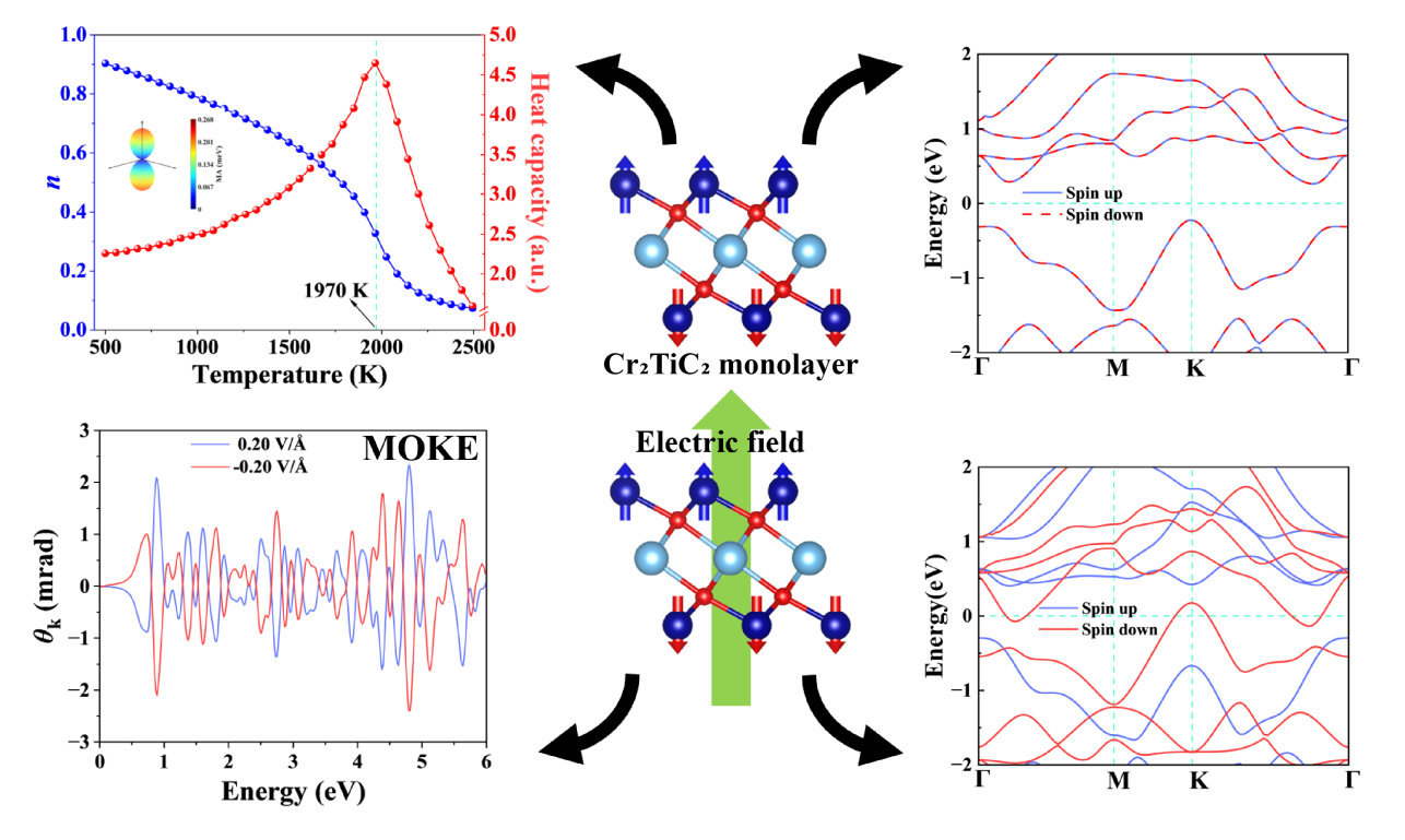 对于自旋电子学领域难以兼顾高密度集成与高效信号读取的瓶颈——即铁磁体因杂散场限制集成度,而反铁磁体因自旋简并难以被探测读取的根本矛盾。我们提出一种具有超高奈尔温度的二维Cr2TiC2单层碳氮化物(MXene),其具有本征的反铁磁性。通过施加垂直电场,实现了从反铁磁态到全补偿亚铁磁态的转变,这种磁态融合了反铁磁体零净磁化(无杂散场、抗干扰)与铁磁体自旋分裂(具备半金属性、易读取)的双重优势,并且可以通过磁光克尔效应进行实验观测。基于此设计了全新的磁性隧道结模型,为未来开发室温兼具高稳定性与低能耗的下一代自旋电子学器件提供理论方案。