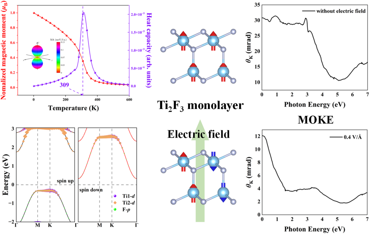 低维磁电多铁材料为发展基于铁电-磁性集成效应的新型信息存储处理以及磁电器件提供了巨大的潜在应用前景。磁性半导体中通过铁电序和磁序的交叉耦合调控,可同时控制电子的电荷、自旋和极化等属性,实现信息处理、传输和存储功能集成在单一芯片的功能。然而,由于铁电序和磁序的物理起源不同,现实中本征室温低维磁电多铁半导体材料非常罕见。结合第一性原理计算和蒙特卡洛模拟,研究了二维Ti2F3多铁半导体的原子结构、电磁及铁电特性,探究了电场对其磁相变和磁光效应的调控效果。