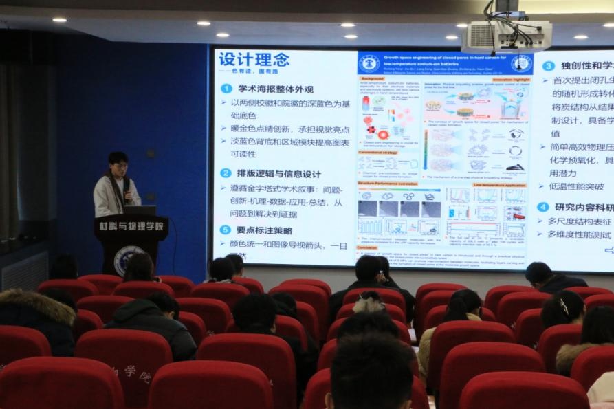 11月20日,由校党委研究生工作部、研究生院和我院主办的“智启研路,海报华章”第三届学术海报设计大赛优秀作品汇报答辩会在材料楼A105报告厅举行。研究生院副院长丁淮、学院院长冯培忠、副院长鞠治成、副院长唐军等出席活动,学院老师康学勤、顾修全、陈令修等担任大赛决赛评委。