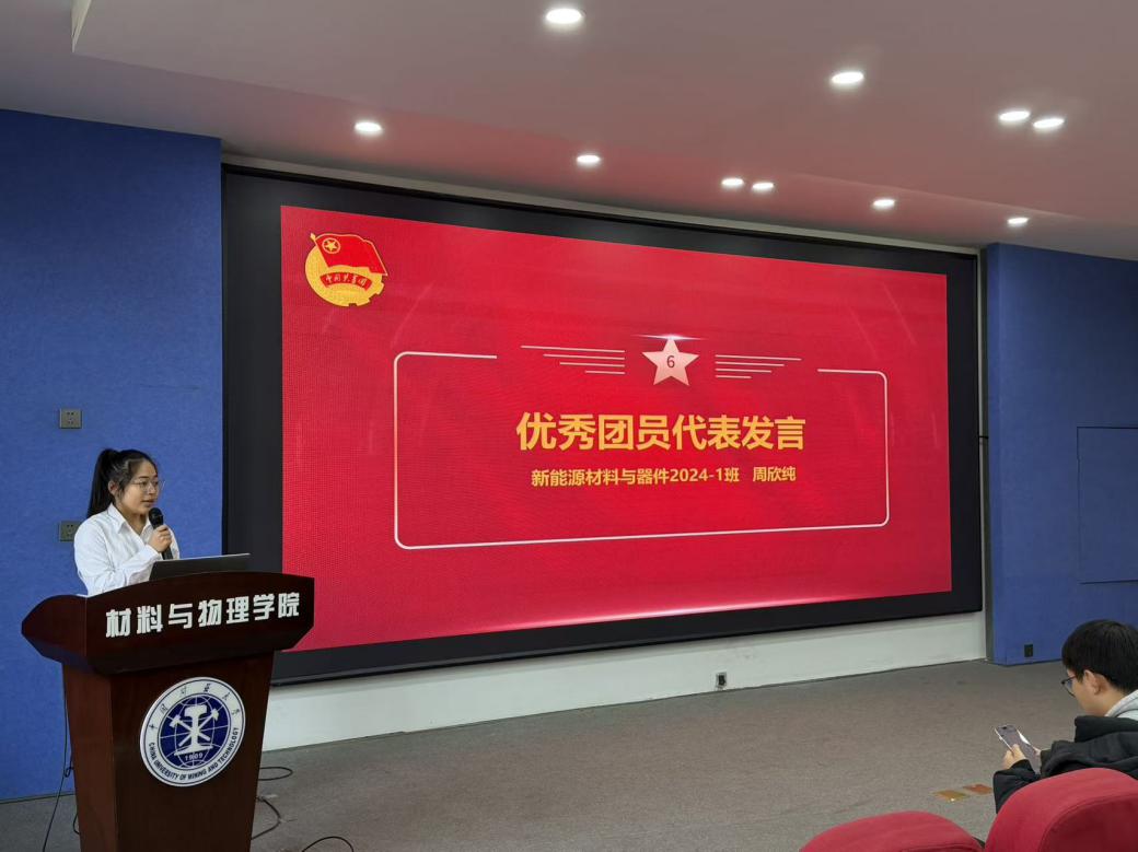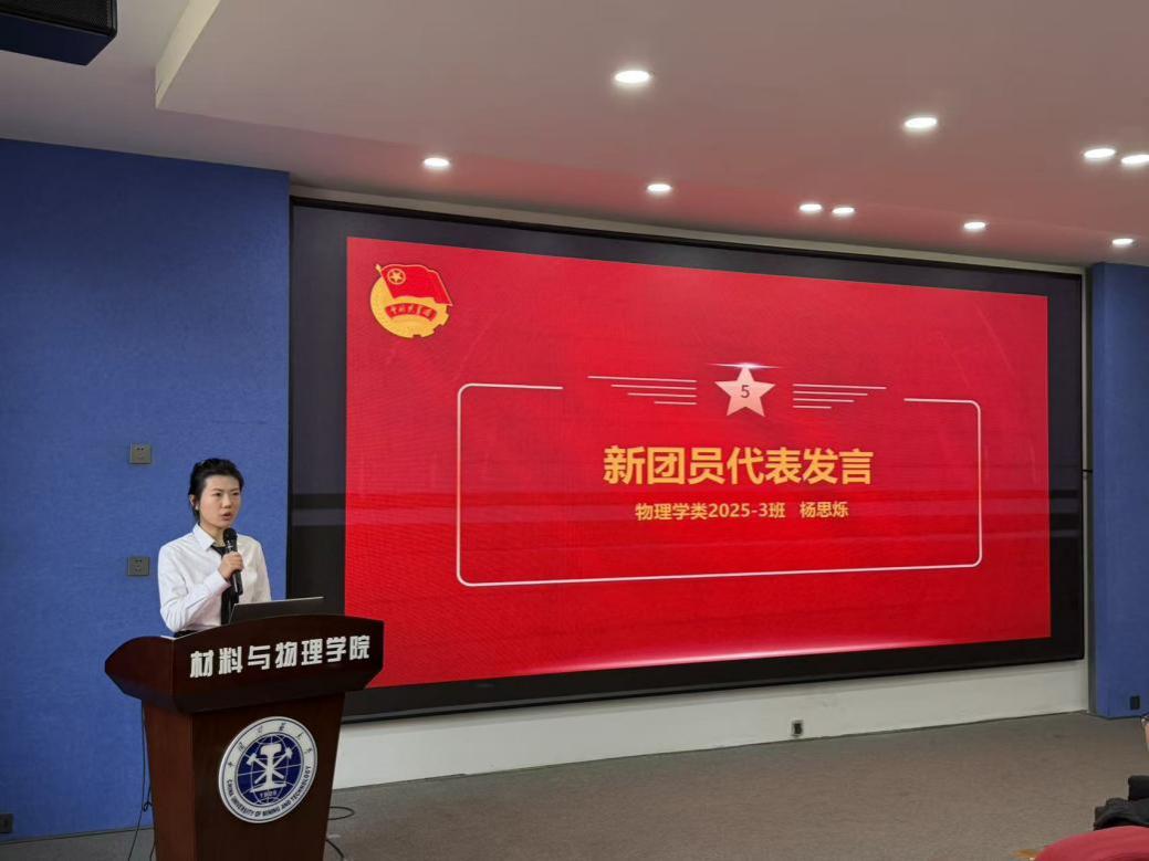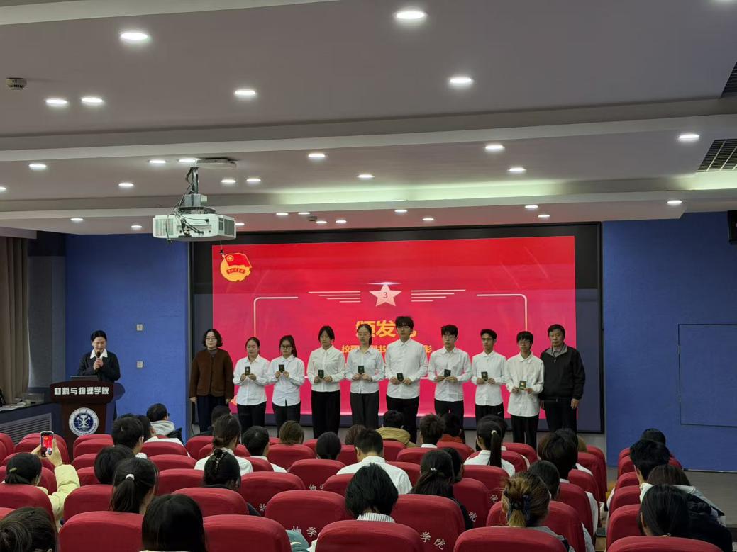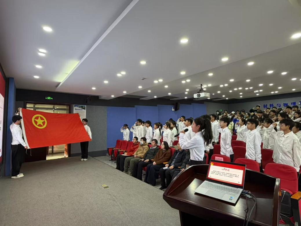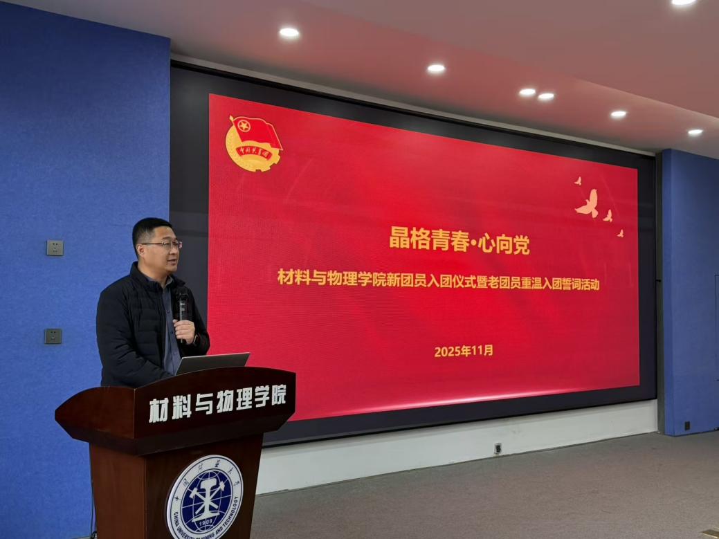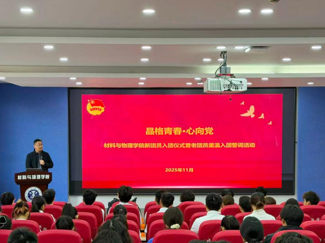 11月27日,材物学院在材料楼A105举行了2025年下半年新发展团员入团仪式暨老团员重温入团誓词活动。校团委副书记徐彤彤、院党委副书记李智、院关工委常务副主任刘金龙、各年级辅导员、全体新发展团员以及部分老团员参加本次活动。活动由院团委书记孟雅婷主持。
