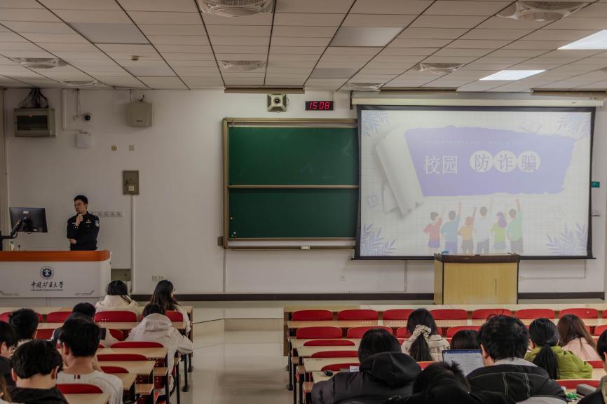 课堂上,民警结合矿大及周边高校真实案例,介绍了目前高发的6种诈骗类型以及常见骗局的作案套路,详细拆解了近年来流行的诈骗手段,并分享了公安机关介入劝阻的真实案例,提醒学生警惕“沉没成本陷阱”和“高收益诱惑”。此外,民警还介绍了电信网络诈骗的概念、起源、现状,分析了易受骗人群的特点并带领同学们通过课堂练习巩固了所学知识。