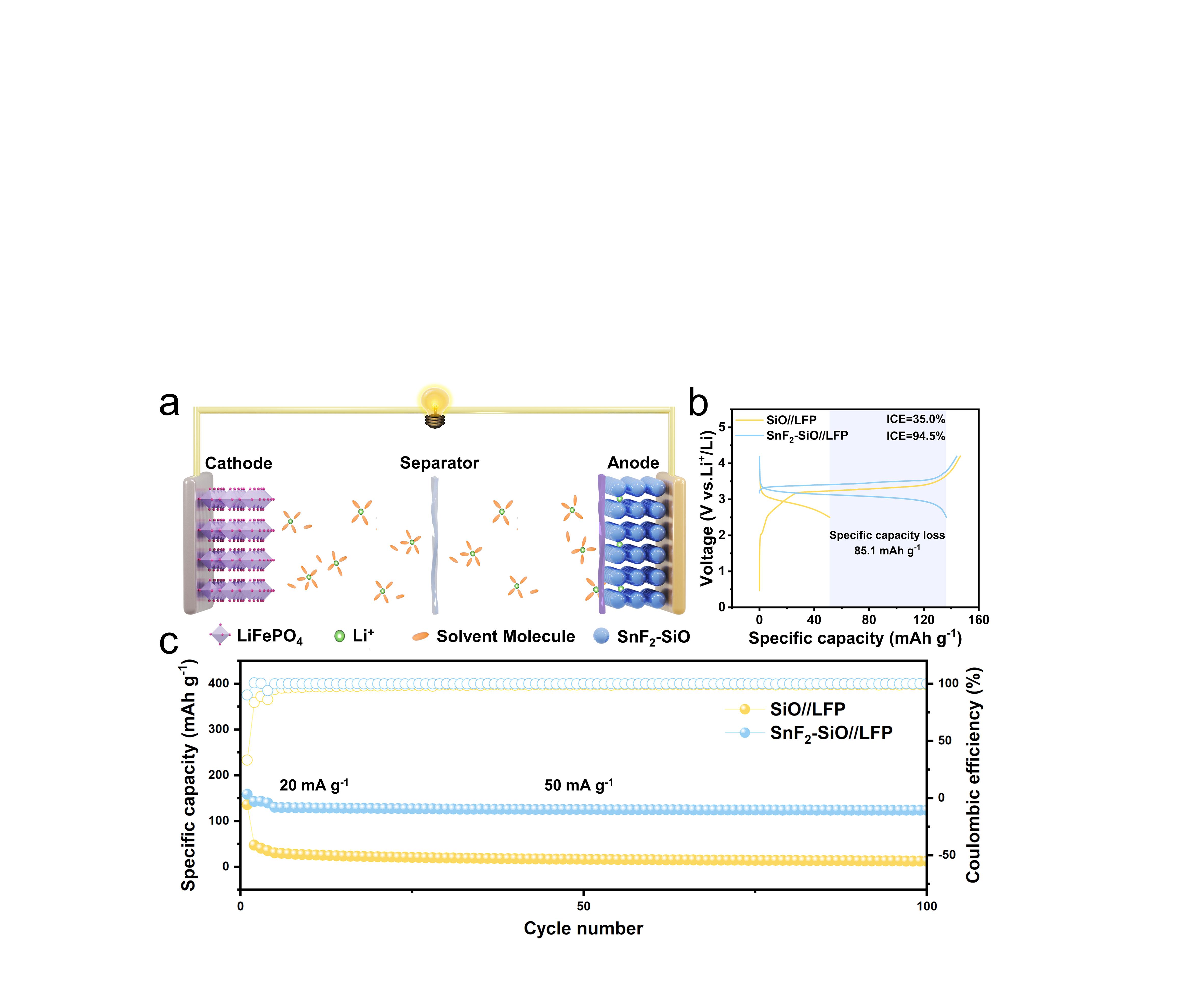 本工作采用锂-芳烃络合物(Li-BP/2-MeTHF)对SiO进行快速化学预锂化,仅需1.5分钟即可将SiO的ICE从81.2%提升至99.5%,有效补偿了初始锂损耗(Pre-SiO)。然而,在化学预锂化过程中,SiO中过早形成的锂硅化物(LixSi)会引发更严重的体积膨胀,导致应力集中和界面不稳定,从而导致Pre-SiO循环稳定性不理想。为解决该问题,研究团队进一步引入功能化SnF2,利用其与锂之间的氧化还原电位差,在Pre-SiO表面原位诱导SnF2的还原分解与界面化学反应,构建了一层兼具高机械强度与锂离子传输动力学的LiF/Sn-Li混合SEI层(SnF2-SiO)。