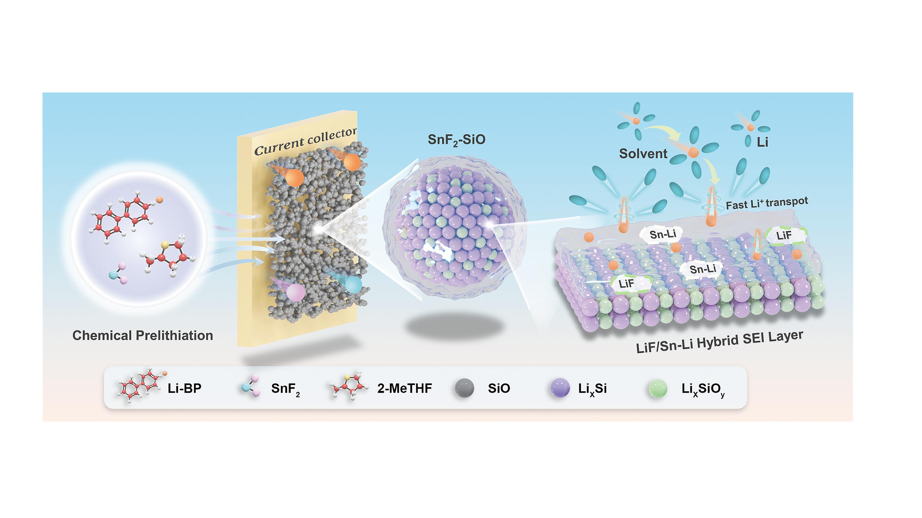 化学预锂化硅基负极表界面重构机理示意图