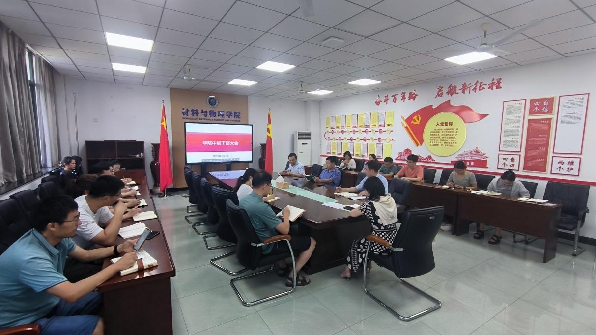 7月7日上午9点钟在材料楼A501,学院举行中层干部大会。院领导班子成员、党委委员、教职工支部书记、各系(中心)主任以及辅导员参加会议,会议由学院党委书记刘建光主持。