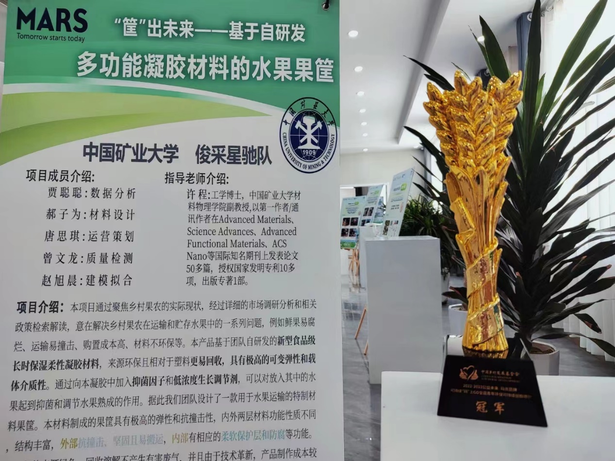 8月8日,第九届可持续玛上GO全国青年环保可持续创新项目全国总决赛在雄安新区胡各庄村拉开帷幕。大赛由玛氏箭牌和中国乡村发展基金会共同主办,雄安新区胡各庄村协办。经过区域赛筛选,来自全国54所高校共162支队伍晋级。经过激烈角逐,由我院许程老师指导,本科生郝子为等人参与的项目《“筐出未来”——基于自研发多功能凝胶材料的水果果筐》荣获全国赛第一名的优异成绩。项目前期成果曾入驻中国矿业大学青创广场,获得国际互联网+大赛奖项并入选江苏省大学生创业项目,目前已经孵化2家公司。